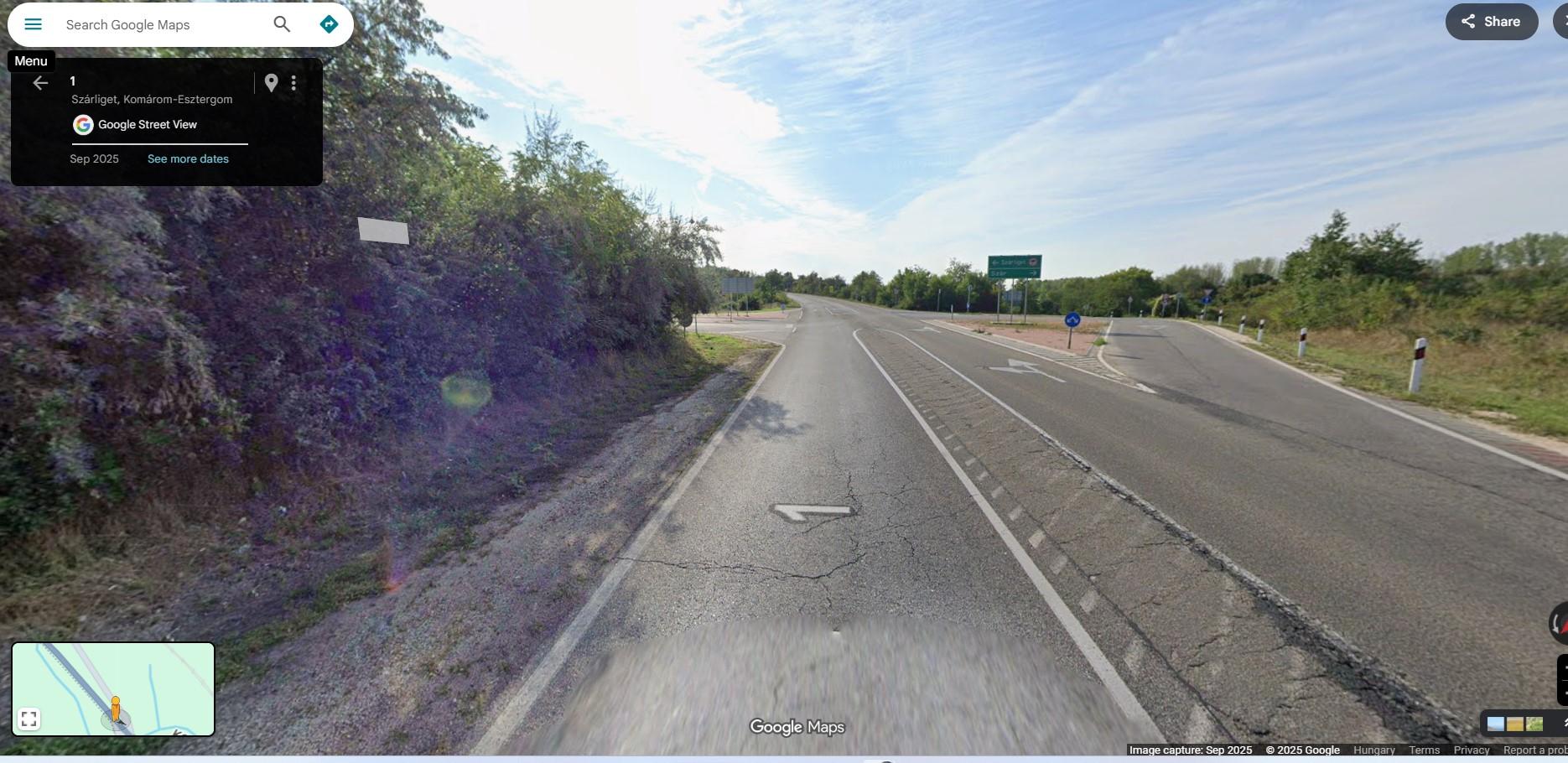 Leírás: Tapasztalataim szerint a Bicske irányába haladó járművek gyakran nem várják meg a Szárliget felé kanyarodó autósokat, hanem jobbról kikerülik őket. Emiatt a lekanyarodni kívánó autósok sok esetben a bal oldalt található, forgalomtól elzárt területet használják kanyarodósávként. Bár ez szabálytalan, a gyakorlat azt mutatja, hogy a jelenlegi forgalmi helyzet erre kényszeríti a közlekedőket, mivel a kijelölt kanyarodósáv hiánya torlódást és balesetveszélyt eredményezhet.