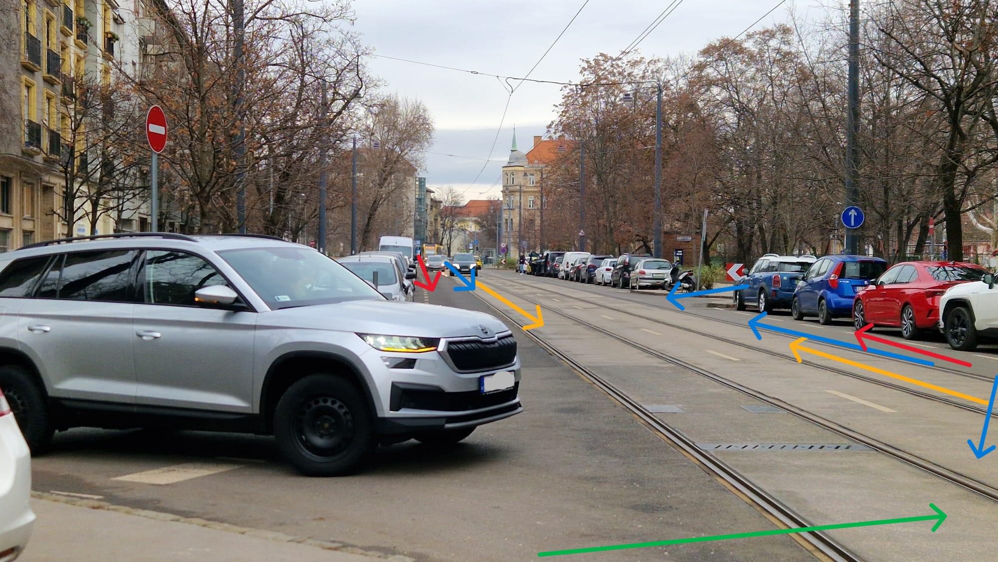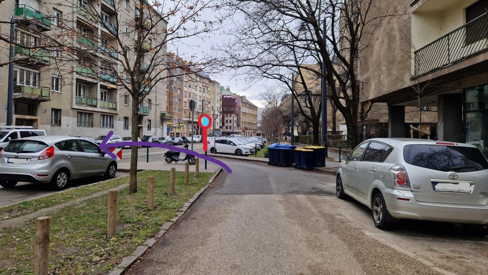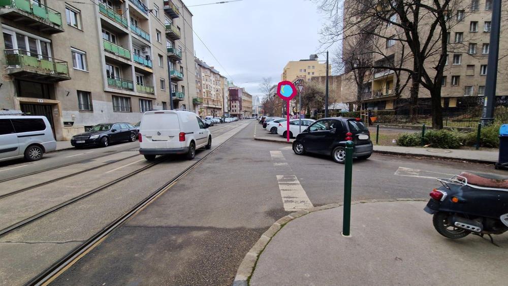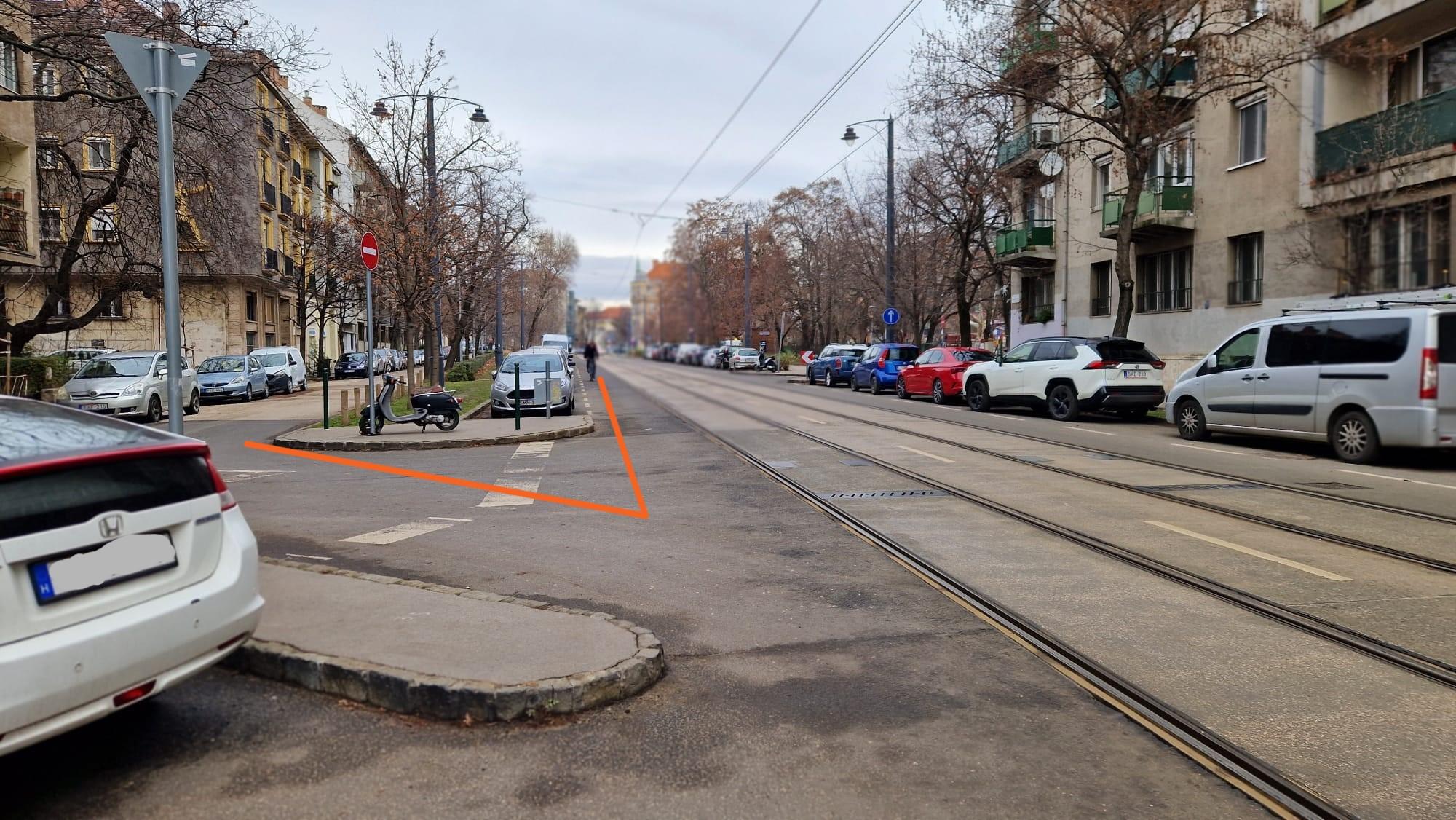 Leírás: A Frankel Leó utca 57 - Zsigmond tér 1 kereszteződés autóval közlekedve a szervizútról a Frankel Leó útra fordulva nehezen belátható és a villamosok miatt élet és balesetveszélyes. A főúton parkoló autóktól nehezen belátható a kereszteződés, ezért túl nagy mértékben előre kell gurulni (a KRESZ szerint feltüntetett vonalon túl kell menni), hogy lássa az ember mi jön, mehet-e. A kereszteződésben egyébként jöhet szabálytalan gyalogos 1 felől, bringa és villamos 2 felől, autó 4 felől, szóval sok a lehetőség balesetre! Javasolnék egy domború tükröt, ami segíti a kereszteződés belátását. A mellékelt képeken berajzoltam itt-ott.